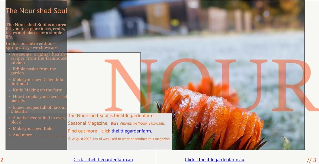 The Nourished Soul is The Little Garden Farm’s E Magazine showcasing the season’s best recipes, crafts, native plants and birds, farm stuff and more.